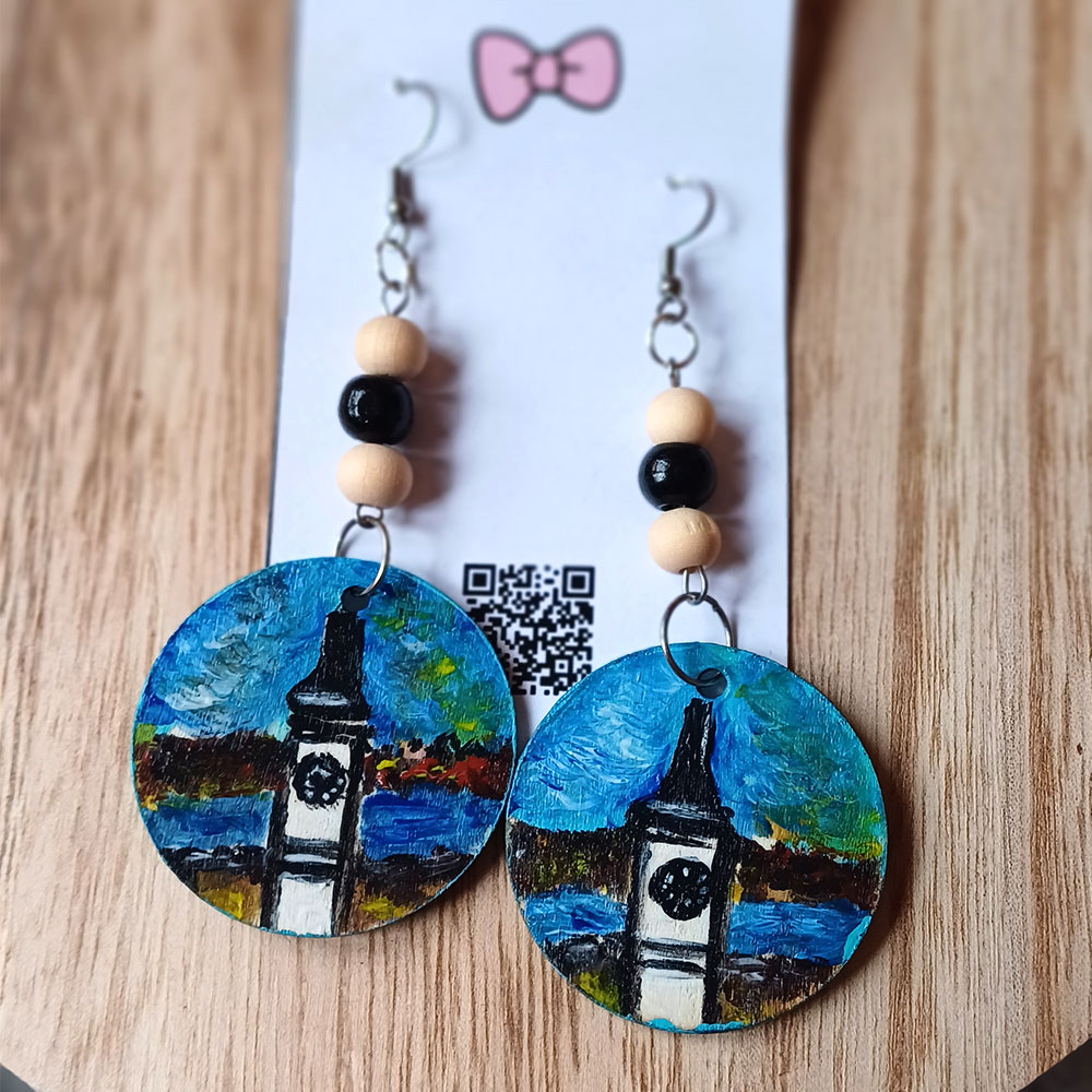 Crafted from natural wood and meticulously hand-painted, each earring features a beautifully illustrated Fortress motif — symbolic of protection, heritage, and timeless stories carried through centuries.