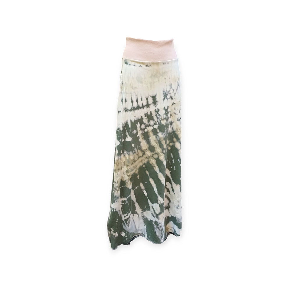 Moss Earth Dip captures the quiet poetry of nature — where forest moss meets sunlit soil. Each skirt is hand-dyed using a careful ice-bleaching process that reveals soft transitions between earthy greens, muted browns, and delicate beige tones. 🌱 The result is a flowing piece that feels calm, grounded, and deeply connected to nature’s rhythm.