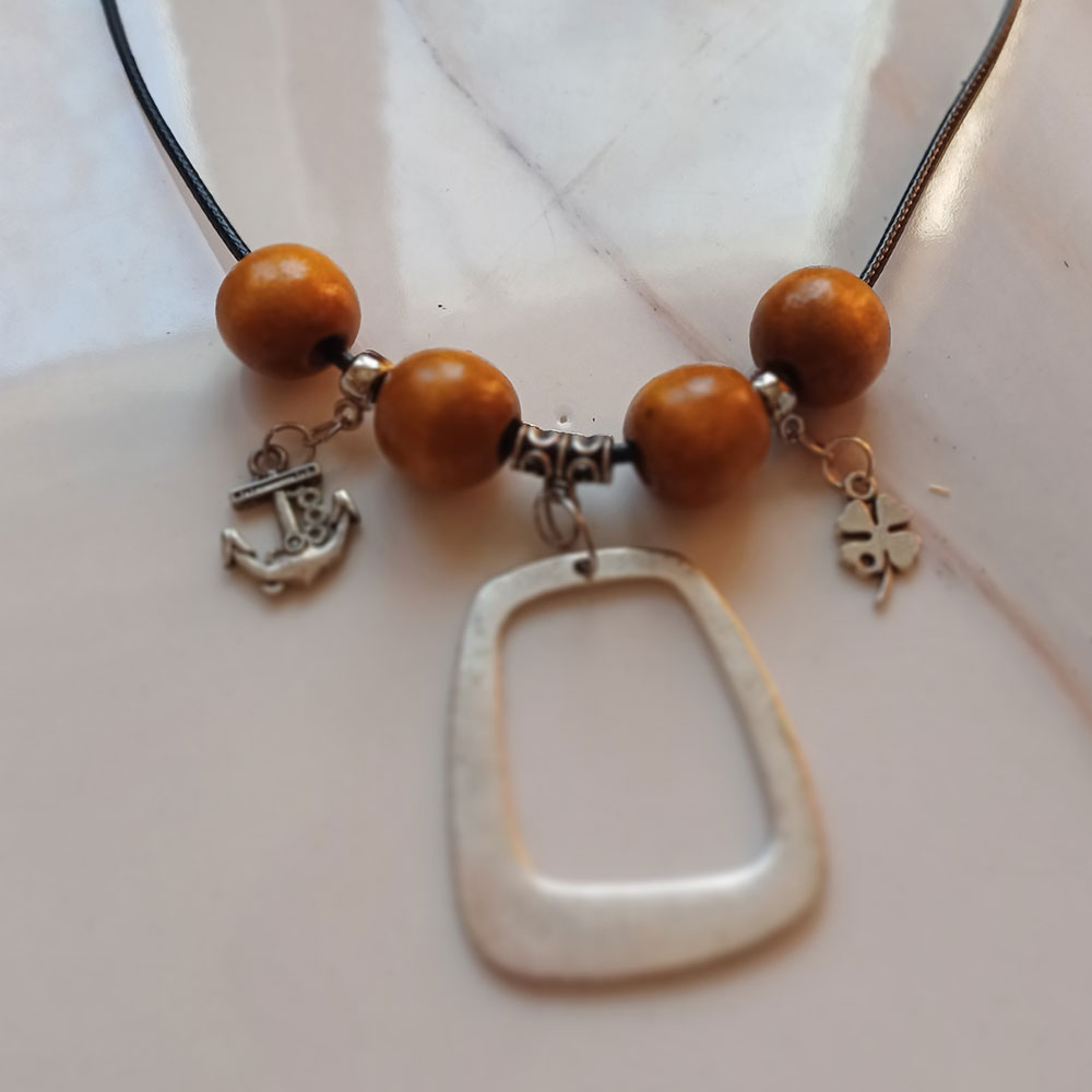 • Materials: Dark Wood, Metal Charms (Silver-Toned), Cord.