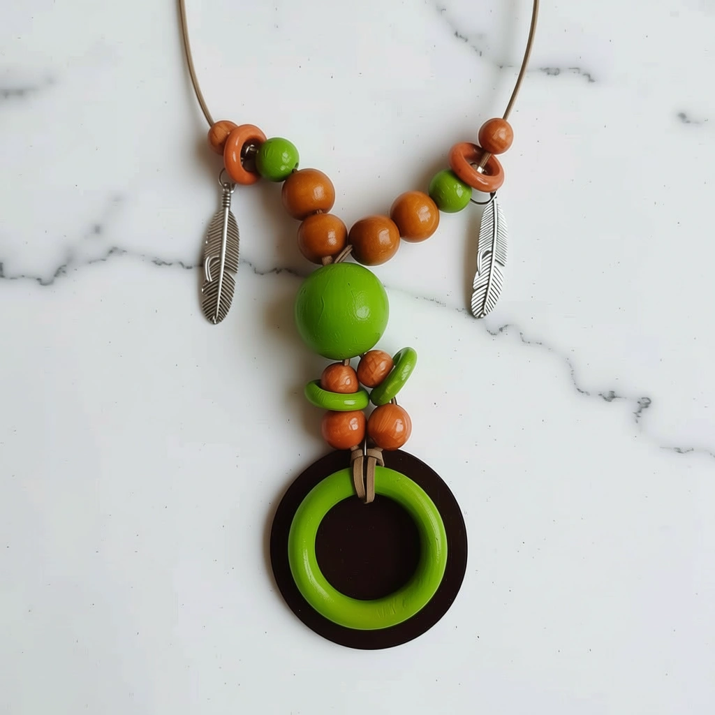 • Materials: Dark Wood, Metal Charms (Silver-Toned), Cord.