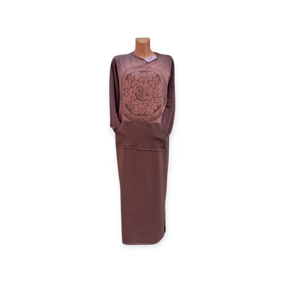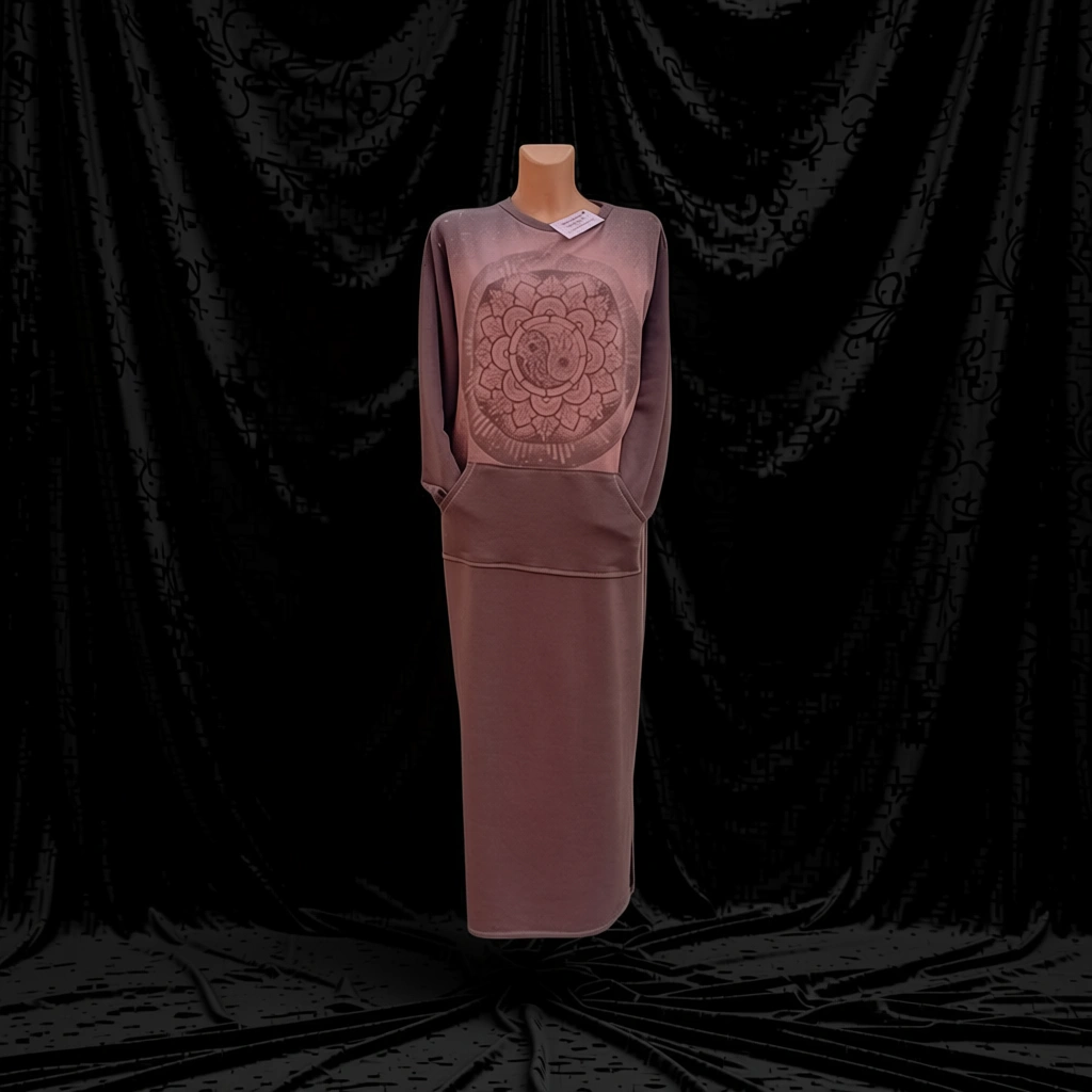Taupe Mandala Flow embodies warmth, balance, and artistic expression. Crafted in a deep taupe/beige-brown hue, this long dress or tunic features a hand-bleached Yin-Yang style mandala at the chest, radiating harmony and mindful energy. The dress combines elegance with comfort, boasting long sleeves, cozy fabric, and thoughtfully accentuated seams that enhance the flowing silhouette.